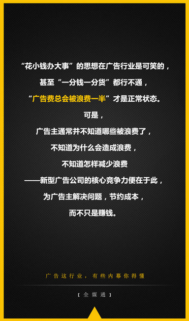 “花小錢辦大事”的思想在廣告行業(yè)是可笑的,甚至“一分錢一分貨”都行不通,“廣告費(fèi)總要被浪費(fèi)一半”才是正常狀態(tài)??墒牵瑥V告主通常并不知道哪些被浪費(fèi)了,不知道為什么會(huì)造成浪費(fèi),不知道怎樣減少浪費(fèi)——新型廣告公司的核心競爭力便在于此,為廣告主解決問題,節(jié)約成本,而不只是賺錢。