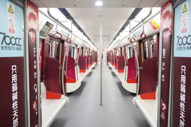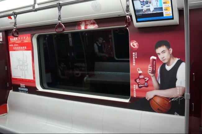 沈陽地鐵創(chuàng)意內(nèi)包車貼廣告飲料快消案例,沈陽地鐵列車廣告價格