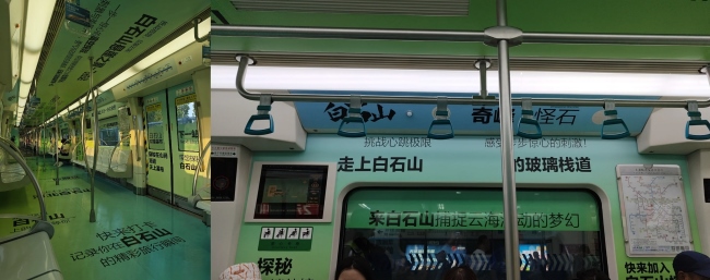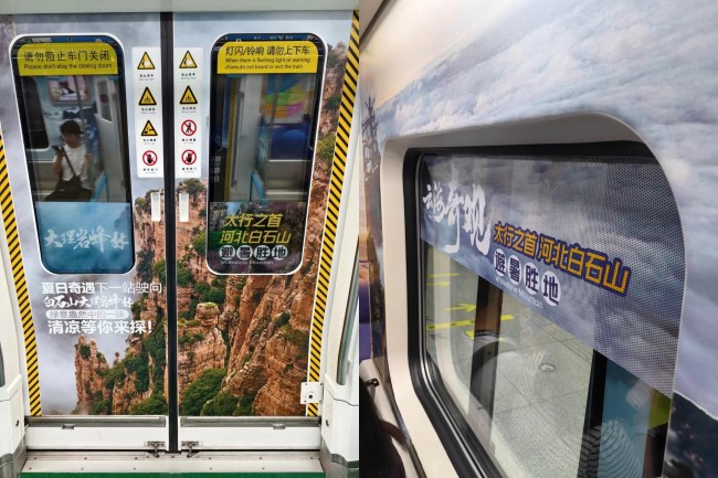 河北白石山景區(qū)廣告亮相天津地鐵,將奇峰、怪石、云海、星河以及無盡的想象帶到天津市民與游客眼前。以大篇幅包天包地的全景內(nèi)包車為載體,連貫展示景區(qū)特色;用涼爽的綠色和藍(lán)色為廣告背景主色調(diào),使乘客在炎熱夏天的地鐵車廂中沉浸式體驗避暑勝地景區(qū)。今天第一戶外小編給大家介紹下天津地鐵創(chuàng)意列車廣告價格和優(yōu)秀案例分享。