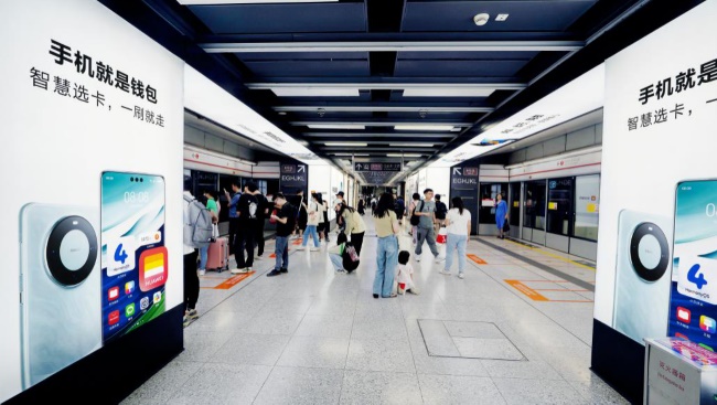 上梅林站4號線與9號線的換乘通道途經(jīng)4號線候車的站臺區(qū)域,筑夢空間換乘通道廣告采用大屏搭配燈箱、墻貼等媒體形式,視覺效果沖擊力強,將乘客帶入廣告場景,品牌存在感極強。乘客途經(jīng)通道換乘過程中通常容易把注意力集中在周邊環(huán)境而非手機,通道內(nèi)空間集中、媒體多樣,可實現(xiàn)對品牌的集中曝光展示以及對龐大客流的包圍。大面積地鐵廣告畫面,易形成較強的視覺延伸、視覺沖擊力和品牌震撼度。