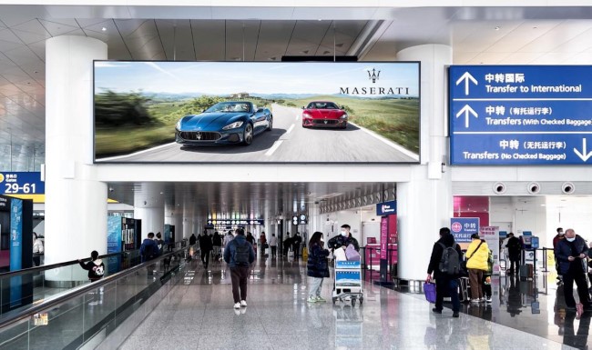 T3國內(nèi)出發(fā)A區(qū)、B區(qū)安檢正上方:2面LED大屏,尺寸34.4m×5.1m,100%覆蓋T3國內(nèi)國際出發(fā)乘客,提供極致視覺效果。