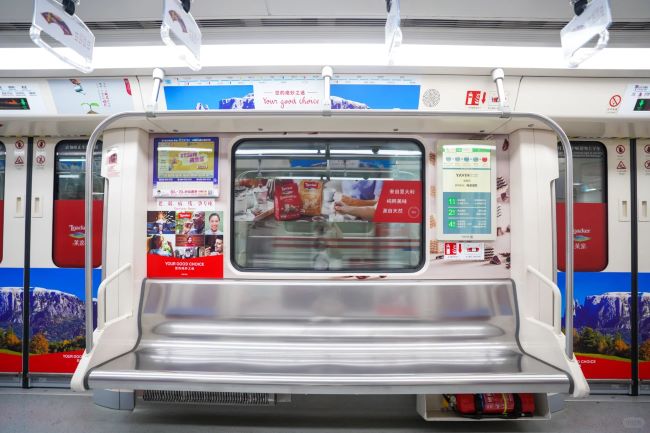 長沙地鐵品牌列車內(nèi)包車廣告的車窗貼和車窗墻貼平行于乘客視線,閱讀距離≤1米;車門和玻璃貼位于乘客上下車必經(jīng)觸點,單次閱讀時長5-8秒;車廂框架位于車窗與車門間,利用乘客移動路徑實現(xiàn)二次曝光;車廂壁貼覆蓋車廂內(nèi)壁,形成品牌信息環(huán)繞。250塊廣告位組合構(gòu)建沉浸式環(huán)境形成360°品牌空間,消除視角盲區(qū)。乘客從上車至下車全程接觸廣告,平均曝光時長 15-20分鐘/人次。