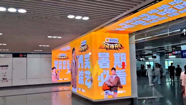 杭州地鐵濱康路站換乘通道墻面超長(zhǎng)LED大屏廣告位于單側(cè)墻面,結(jié)合包柱大屏,形成了一個(gè)總面積達(dá)228平方米的連續(xù)視覺(jué)陣列。這一超大尺寸的展示面積在相對(duì)封閉的通道環(huán)境中具有強(qiáng)烈的視覺(jué)沖擊力,能夠有效吸引乘客注意力。其次,廣告位位于乘客換乘的必經(jīng)動(dòng)線上,確保了信息能夠覆蓋所有換乘人群,實(shí)現(xiàn)了高效觸達(dá)。高頻次的播放能夠?qū)Τ掷m(xù)流動(dòng)的換乘客流進(jìn)行反復(fù)提示,有助于強(qiáng)化品牌印象。超長(zhǎng)屏幕與包柱組合的媒體形式,還在通道內(nèi)創(chuàng)造了環(huán)繞式的視覺(jué)體驗(yàn),提升了品牌展示的整體性。
