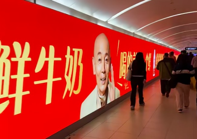 北京地鐵國(guó)貿(mào)站主題換乘通道墻面廣告整合了LED弧形屏、豪華燈箱與墻貼等多種形式,構(gòu)成了一個(gè)連續(xù)、完整的視覺展示面。這種組合將動(dòng)態(tài)屏幕的現(xiàn)代感與燈箱的靜態(tài)沖擊力相結(jié)合,豐富了廣告的呈現(xiàn)層次。通道兩側(cè)超長(zhǎng)且連貫的墻面設(shè)計(jì)形成了“頂天立地”的視覺效果,在相對(duì)封閉的通道內(nèi)對(duì)乘客形成視覺上的包圍感,增強(qiáng)了品牌的傳播氣勢(shì)。內(nèi)打光燈箱在通道環(huán)境中不僅保證了畫面色彩鮮艷、細(xì)節(jié)清晰,其自身發(fā)出的光線在略顯昏暗的環(huán)境中尤為醒目,能主動(dòng)吸引乘客視線。