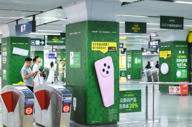 杭州地鐵鳳起路站站廳層品牌森林廣告通過包柱與吊旗的組合,在站廳層構(gòu)建了一個(gè)多維度的品牌展示空間。立柱通常位于乘客動(dòng)線的核心區(qū)域或關(guān)鍵節(jié)點(diǎn)。創(chuàng)意包柱廣告因此能夠?qū)崿F(xiàn)多角度、近距離的曝光,確保信息高效傳遞。結(jié)合吊旗從上至下的視覺引導(dǎo),共同在有限的站廳空間內(nèi)營(yíng)造出豐富多元、活力滿滿的視覺盛景。多根立柱同時(shí)進(jìn)行創(chuàng)意包柱,形成了規(guī)?;拿襟w矩陣。這種陣列式布局能對(duì)穿行其間的乘客產(chǎn)生持續(xù)的視覺影響,營(yíng)造出強(qiáng)烈的品牌陣勢(shì)和包圍感。