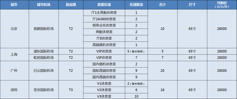 1.按機(jī)場(chǎng)收取上刊服務(wù)費(fèi),1500元/次/機(jī)場(chǎng),每增加或更換一次發(fā)布內(nèi)容,將相應(yīng)加收一次上刊服務(wù)費(fèi); 2.提前10個(gè)工作日提供上刊物料,畫面要求為JPG文件,寬1080像素x高1920像素,精度要求72DPI; 3.視頻廣告上刊單次另加500元/次/臺(tái)的服務(wù)費(fèi)用; 4.23個(gè)城市24位機(jī)場(chǎng),其中上海覆蓋浦東國(guó)際機(jī)場(chǎng)及虹橋國(guó)際機(jī)場(chǎng)。 |