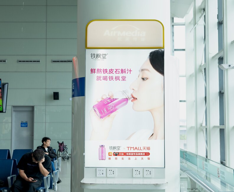 媒體位置:T2二層出發(fā)候機(jī)安檢后,左右通廊拐角處墻面燈箱