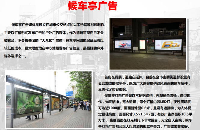 1、發(fā)布周期:14天 ?????? 2、發(fā)布費(fèi):4400元/塊/2周 ?????? 3、制作費(fèi):800元/塊/次? 4、單塊候車(chē)亭規(guī)格 3.5米*1.5米*2面???夜間亮燈,根據(jù)季節(jié)調(diào)節(jié)亮燈時(shí)間