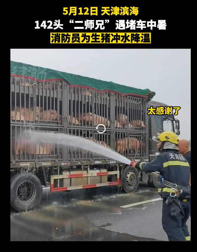 5月12日濱海新區(qū)消防救援部門接到救援報告,一輛裝載142頭生豬的貨車因高速堵車2小時,導(dǎo)致‘二師兄們’長時間處于高溫狀態(tài)下中暑。