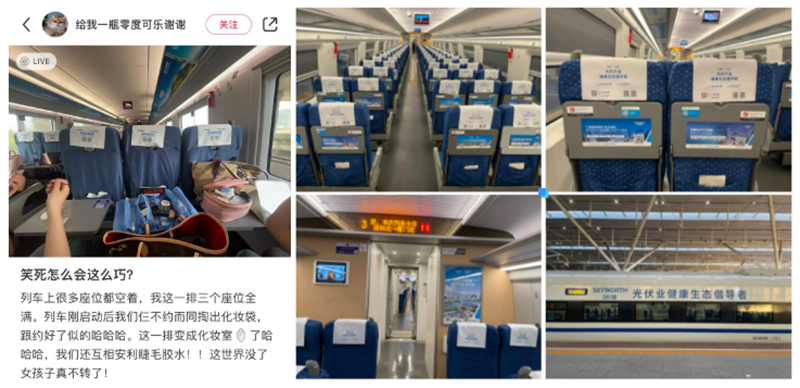 高鐵列車上三連座的三位陌生人同時掏出化妝包鋪滿高鐵小桌板,默契行為被博主拍照發(fā)布到小紅書。創(chuàng)維光伏的高鐵列車頭枕巾廣告、高鐵列車行李架彩貼廣告也一同出鏡,形成二次傳播。