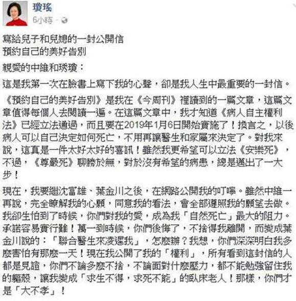 日前,臺灣知名作家瓊瑤在Facebook公開了一封致兒子兒媳的信,以不容置疑的口吻表達了對自己死亡的安排。