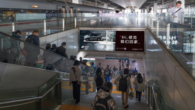 廣州南站站臺(tái)到達(dá)層出站通道扶梯上方楣頭燈箱廣告正對(duì)出站人群搭乘扶梯和走樓梯客流。覆蓋出站所有人群,且媒體與人的視線呈垂直角度,廣告效果比較直觀,出站旅客有一定的時(shí)間停留性。燈箱廣告面積較大,既可用作扶梯電梯進(jìn)出站方向指引,亦可充當(dāng)照明設(shè)備,在較暗的站臺(tái)環(huán)境中發(fā)光非常醒目。視覺(jué)沖擊力強(qiáng)。聯(lián)排套裝投放彰顯品牌形象,提高有效曝光率。