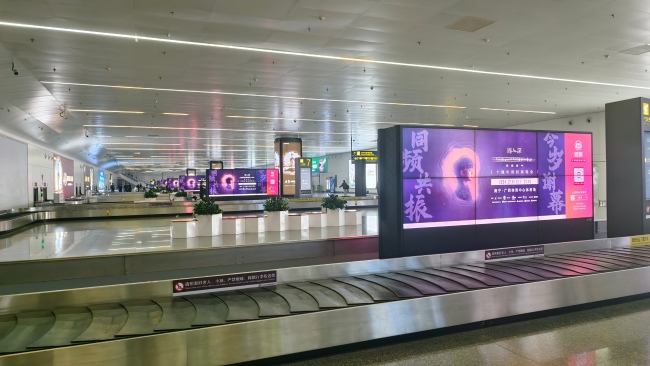南寧機場國內(nèi)到達行李轉(zhuǎn)盤上方LCD大屏廣告14面LCD大屏形成行李大廳視覺矩陣,總展示面積超115㎡,無縫覆蓋旅客視野,動態(tài)畫面同步輪播,品牌記憶度較單屏提升60%。大屏位于行李轉(zhuǎn)盤正上方,旅客抬頭提取行李時自然注視,視覺焦點集中,無信息干擾。旅客處于抵達南寧后的“服務(wù)搜索期”,對本地交通、酒店住宿、文旅信息及即時消費需求迫切,廣告內(nèi)容與場景需求高度契合,信息接收意愿及轉(zhuǎn)化效率顯著提升。