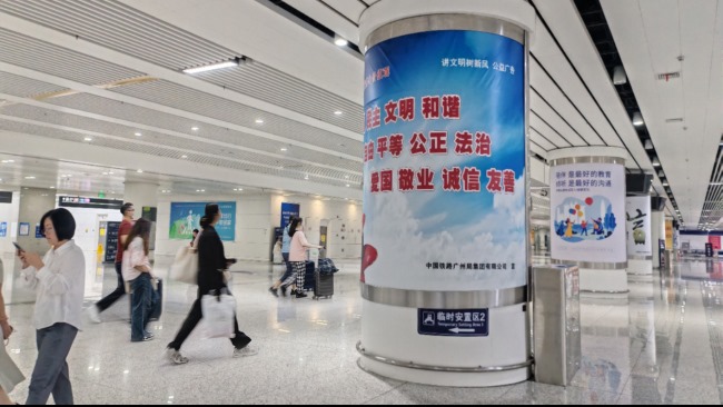 - 候車(chē)大廳幾何中心的品牌陣列:廣州白云站三角立柱燈箱廣告2026-02-25