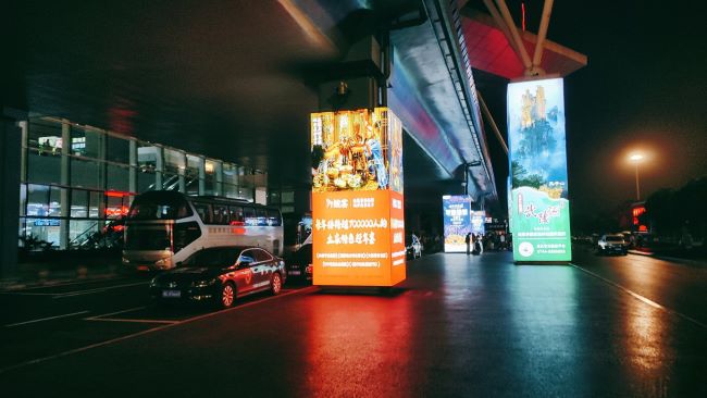 張家界機(jī)場航站樓出口門廊包柱燈箱廣告同時覆蓋到達(dá)機(jī)場的旅客以及接機(jī)人群,6根立柱在兩條行車道中間形成一道強(qiáng)大的視覺矩陣。無論旅客和接機(jī)人員從哪個方向走來,或是車輛從哪個車道駛?cè)?,都無法避開廣告畫面的包圍,實現(xiàn)了真正意義上的全景式無遺漏觸達(dá)。多根立柱聯(lián)排展示,其規(guī)?;囊曈X延伸效應(yīng)遠(yuǎn)勝于單根立柱。4.6米的高度在戶外環(huán)境中形成強(qiáng)烈的視覺統(tǒng)治力,結(jié)合無邊框全景燈箱的設(shè)計,畫面整體感和視覺沖擊力非常突出,能第一時間抓住所有人的注意力。