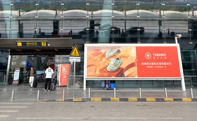 南寧機(jī)場T2航站樓三層國內(nèi)出發(fā)廳大門入口處站立式燈箱廣告位于航站樓玻璃墻與戶外行車道之間,正處于旅客從室外進(jìn)入室內(nèi)的空間轉(zhuǎn)換節(jié)點(diǎn)。旅客在此區(qū)域的視線會(huì)自然投向建筑入口,廣告內(nèi)容能夠直接進(jìn)入視野,形成旅客對(duì)機(jī)場商業(yè)環(huán)境的第一印象。單塊燈箱規(guī)格寬近8米,高度超過3米,總面積達(dá)25平方米以上。這種超寬的橫向構(gòu)圖與現(xiàn)代化航站樓的建筑尺度相協(xié)調(diào),在開闊明亮的入口環(huán)境中依然具備強(qiáng)烈的視覺存在感。
