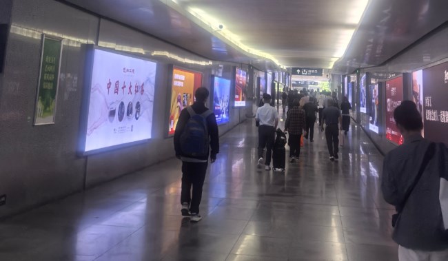 諸暨站出站通道兩側墻面燈箱廣告單塊燈箱廣告牌橫長超4米的尺寸,在通道相對封閉的環(huán)境中極具視覺沖擊力。這種規(guī)?;?、一體化的展示,能對行進中的旅客產(chǎn)生持續(xù)的視覺引導和記憶強化,內打燈呈現(xiàn)發(fā)光效果,有效提升品牌形象的權威感與認知度。旅客抵達后,前往交通接駁區(qū)或停車場必須經(jīng)由出站通道,視線會自然掃視通道兩側環(huán)境。出站通道兩側燈箱廣告構成了旅客視野無法回避的 “視覺走廊” ,實現(xiàn)近身距離的強制性曝光。