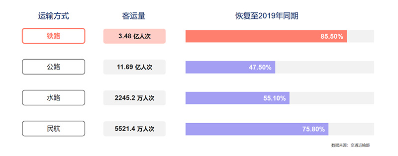 根據(jù)交通運(yùn)輸部數(shù)據(jù)顯示,2023年春運(yùn)期間「鐵路運(yùn)輸客運(yùn)量」3.48億人次,客運(yùn)量人次已恢復(fù)至疫情前2019年同期85.5%水平,在營運(yùn)性運(yùn)輸方式中一枝獨(dú)秀。