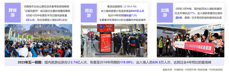 根據(jù)文化和旅游部數(shù)據(jù)顯示,2023年五一假期:國內(nèi)旅游出游合計(jì)2.74億人次,恢復(fù)至2019年同期的119.09%;出入境人員626.5萬人次,達(dá)到過去4年同比的最高峰。