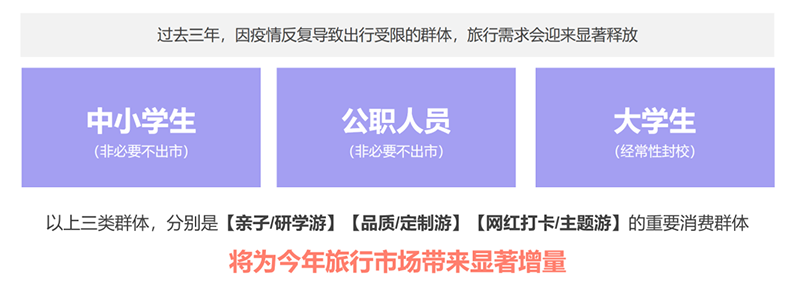 乙類乙管后,跨省游 / 跨境游不再受限,沉寂許久的長線游開始復(fù)蘇, 少出門慎旅游心態(tài)加速化解,跨省遠(yuǎn)途旅行重新回歸—— 旅游消費(fèi)呈現(xiàn) 「走得更遠(yuǎn)、待得更久、消費(fèi)更多」的新特點(diǎn)。 擱置已久的長線旅行,今年將重新回歸更多人的計(jì)劃清單,有望成為旅游市場(chǎng)強(qiáng)勁增長點(diǎn)。