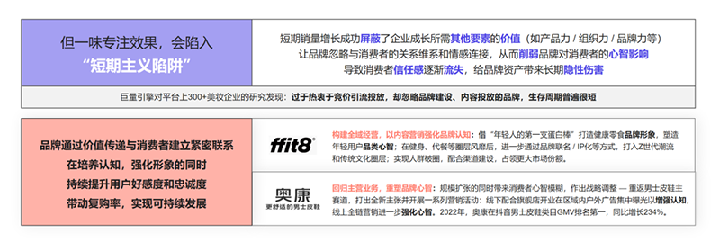 不能因?yàn)槎唐跇I(yè)績(jī)提升,忽略品牌長(zhǎng)期健康發(fā)展,持續(xù)的品牌建設(shè)是賦能生意增長(zhǎng)的重要手段。無(wú)論傳統(tǒng)品牌還是新消費(fèi)品牌,越來(lái)越多的品牌主正在重新回歸品牌建設(shè)之路。