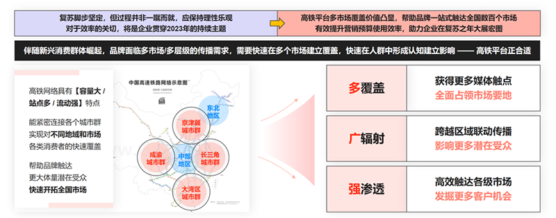 借助高鐵平臺(tái),實(shí)現(xiàn)品牌對(duì)多目標(biāo)市場(chǎng)快速連接形成覆蓋,是企業(yè)實(shí)現(xiàn)效率優(yōu)先的明智之選。