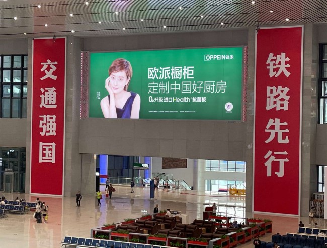 重慶北站候車大廳巨幅燈箱廣告位于離地近10米的站棚墻面,視野良好可視范圍廣。巨型燈箱廣告橫長超18米,高8米,且位于商務車廂候車區(qū)上方,廣告存在感極強。北站地標性廣告位更能提升品牌吸引力和公信力,彰顯品牌高端調性,對品牌傳播影響深遠,是政企宣傳的重要窗口。