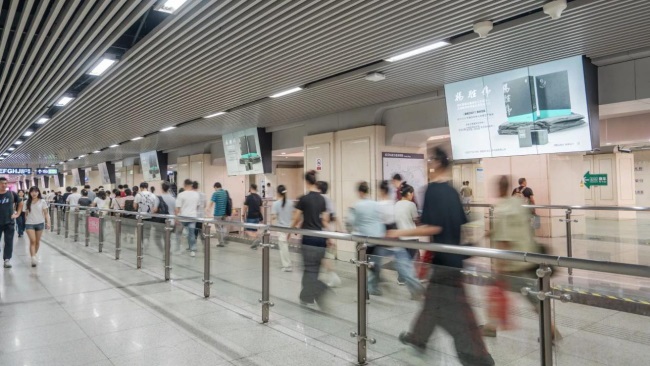 武漢地鐵江漢路站2號線與6號線換乘區(qū)域通道LED大屏套裝廣告全面覆蓋密集的換乘客流,屬于地處黃金位置的動態(tài)廣告形式。大屏廣告與地鐵墻面等高,呈現(xiàn)頂天立地的視覺效果。大屏廣告動態(tài)畫面自體發(fā)光更加吸睛,在換乘通道內(nèi)亦充當(dāng)照明設(shè)備,廣告存在感極強,畫面更具沖擊力。11組LCD廣告屏橫跨整個換乘通道,位于乘客視線上方如影隨形。