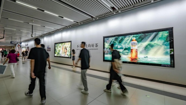 武漢地鐵2號(hào)線循禮門站站廳廣告由墻貼、燈箱等元素構(gòu)成,同時(shí)覆蓋進(jìn)站以及出站的密集客流。巨大的墻貼以及呈現(xiàn)發(fā)光效果的燈箱等廣告形式在循禮門站與眾不同的站廳換乘區(qū)域形成巨大的品牌空間,連續(xù)的品牌長墻可承載更豐富的內(nèi)容,超長時(shí)間吸引往來乘客注意力,以超高的存在感搶占客流視線,形成品牌記憶。
