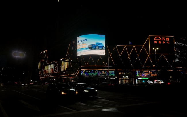 佛山天虹購(gòu)物中心戶外LED大屏廣告屏幕朝向東北方向的十字路口,位于商場(chǎng)外立面上方,折角曲面LED大屏廣告覆蓋魁奇二路與文華中路路口各個(gè)方向車(chē)流與人流,等候紅綠燈可以增加廣告的觀看時(shí)間。大屏廣告寬度226米,高14米,總面積達(dá)308平方米,宛如佇立在魁奇二路旁的巨型名片,完美展示品牌廣告畫(huà)面。