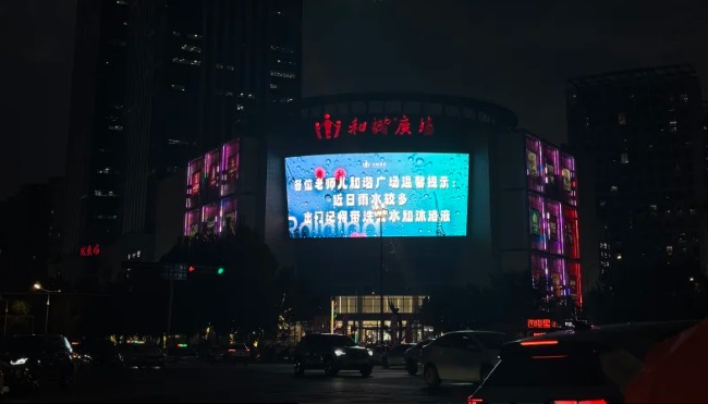 濟(jì)南和諧廣場(chǎng)外墻LED大屏廣告獨(dú)特的弧形設(shè)計(jì)在建筑立面上形成了獨(dú)特的視覺(jué)張力,不僅與建筑外觀更好融合,還能提供更寬廣的視角覆蓋,在復(fù)雜的城市環(huán)境中保持強(qiáng)烈的視覺(jué)存在感與沖擊力。大屏位于商場(chǎng)外墻玻璃幕墻上方高處醒目位置,視野開(kāi)闊,無(wú)遮擋,使廣告信息能夠遠(yuǎn)距離清晰辨識(shí),實(shí)現(xiàn)了對(duì)主干道雙向車流及行人的廣域覆蓋。高頻次的播放策略能夠?qū)θ臻g不同時(shí)段經(jīng)過(guò)的龐大人流和車流進(jìn)行反復(fù)提示,有效利用乘客和駕駛者的碎片化等待時(shí)間,強(qiáng)化品牌認(rèn)知。
